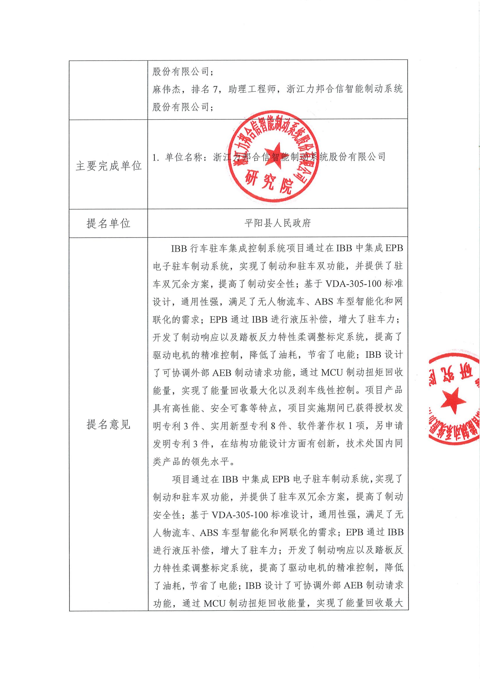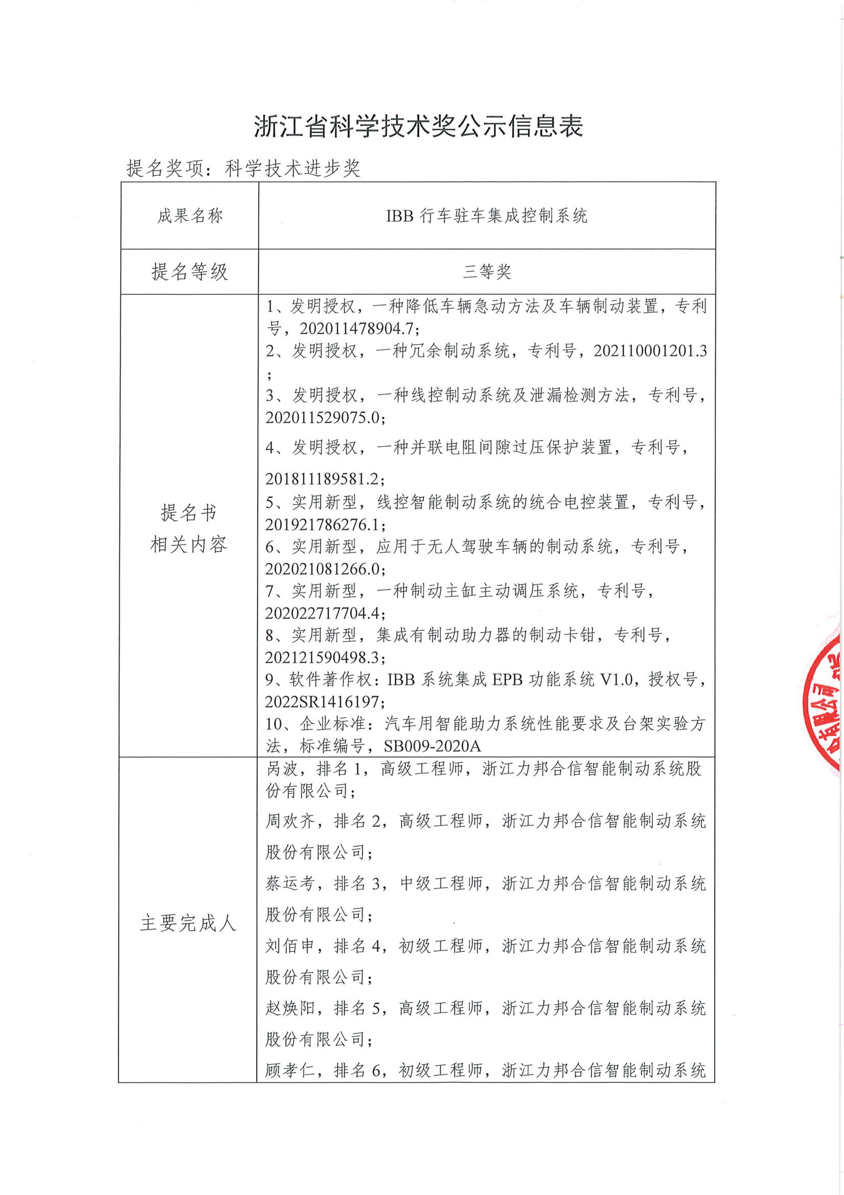 根据《2024年度浙江省科学技术奖提名工作指南》及《浙江省科学技术奖励办法》等文件要求,现将我司呙波、周欢齐、蔡运考、刘佰申等人参与2024年度浙江省科学技术奖拟提名项目成果《IBB行车驻车集成控制系统》进行公示,向社会广泛征求意见。公示时间自2025年9月16日-2025年9月23日(7天),公示期间,任何单位或个人对公示项目有异议的,应当以真实身份书面向我司提出(不受理匿名异议)。我司将按规定对异议者身份予以保护。